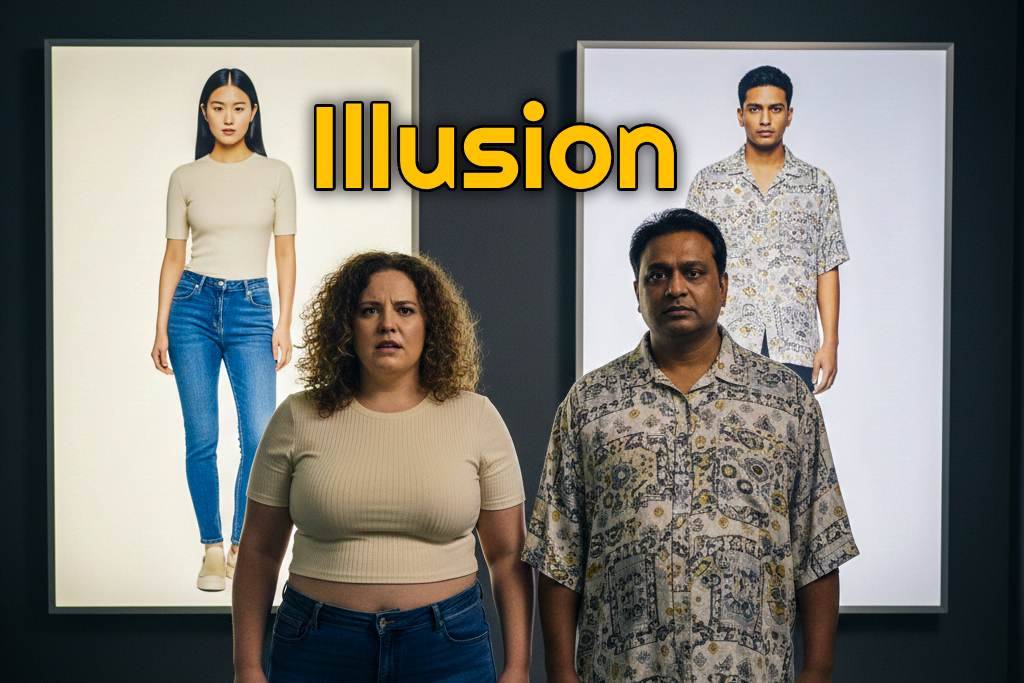 It could be called a classic illusion: if clothes look good on a perfect body, they will look good on you too. This belief is not only misleading — it is a commercially profitable marketing trick based on people’s desire to satisfy their own inadequacies.